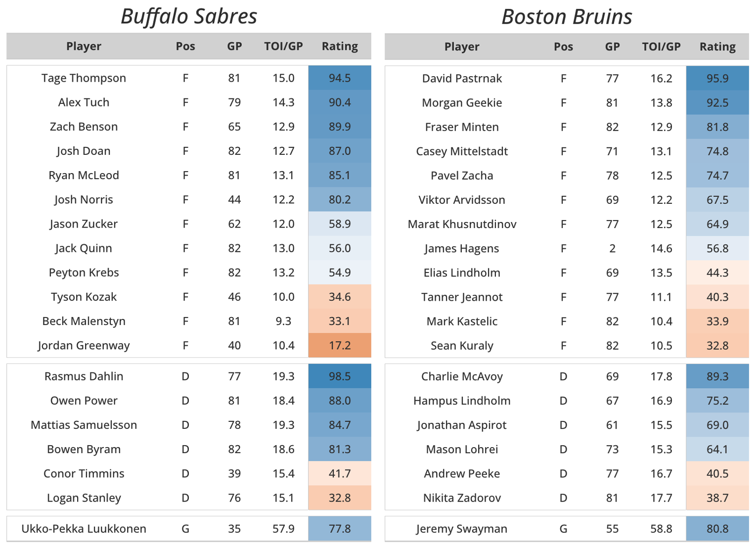 What are the Boston Bruins? How did they end up here? No one really knows. Our preseason projections had them last in the Atlantic with 82 points, yet here we are. And looking at the roster, one that changed very little with a quiet deadline, you can see why. Yes, they have David Pastrnak and Charlie McAvoy, two of the best players in the game who contribute a significant amount to the Bruins when they are on the ice. But after that, the falloff begins. Morgan Geekie backed up his 33-goal 20%+ shooting percentage season last year with 39 goals this season. This helped him lead the team in xGAR, and forces us to ask whether this is normal. Pavel Zacha scored 30 goals this season with a 23% shooting percentage, and Viktor Arvidsson had quite a bounce back season after struggling the last couple of years with the Kings and Oilers. Of course, few are more noteworthy than Jeremy Swayman, who finished third among goalies in SPAR. This is a very different team from the Bruins team that last made the playoffs in ‘23-24. They really don’t belong but persist through shooting, goaltending, and magic(?). With low expectations of winning and an actual memory of playoff competition/gameplay/”what it takes”, maybe there’s something here. While improbable, one can see the possible (not us, we can’t see it). At the very least, the Bruins pose a sneaky upset threat for the Sabres. This one is going to be fun.