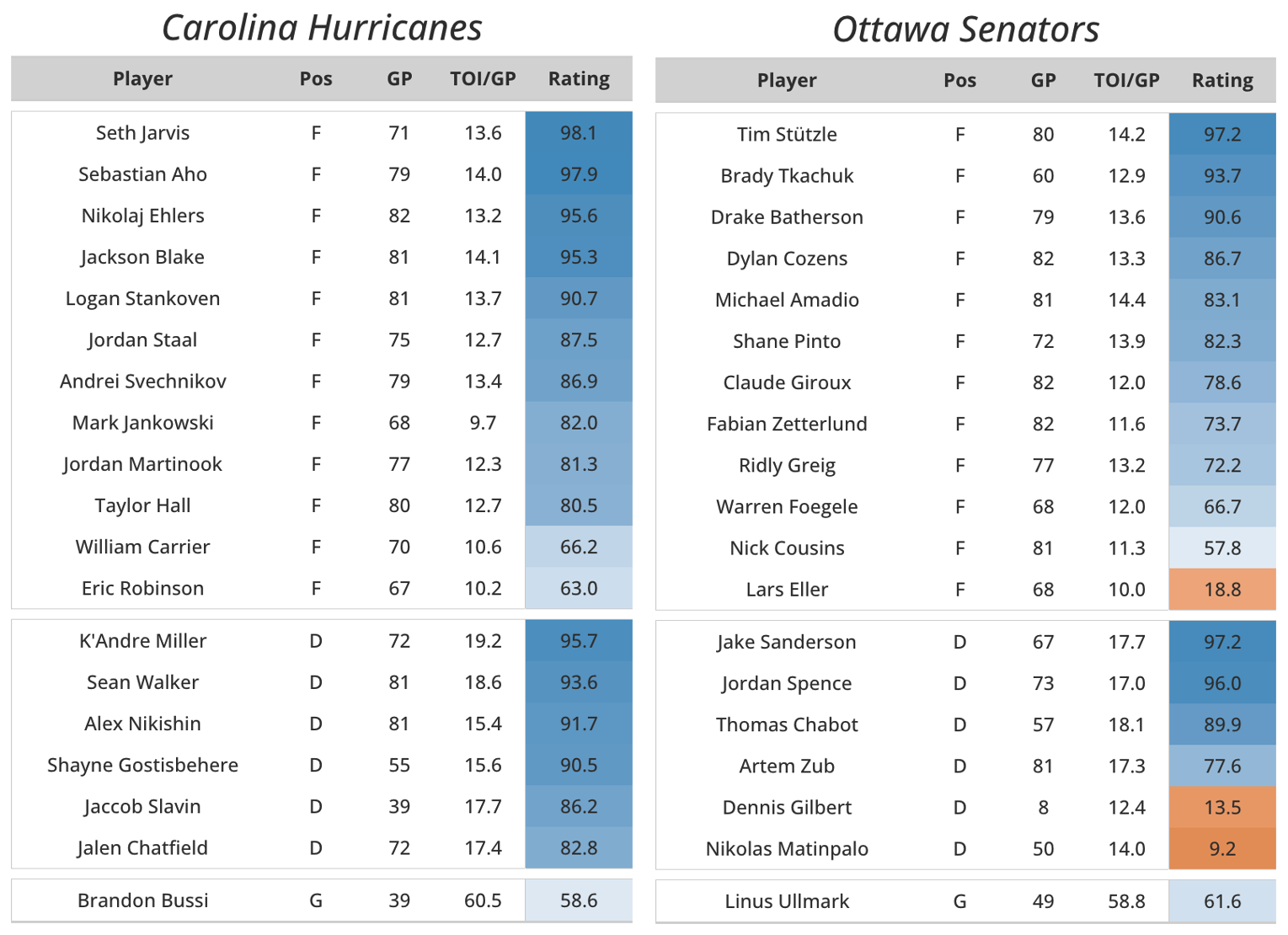 The first step is generating multiple player-level models which produce ratings for all players in the league. For skaters, we found our xSPAR metric (Expected Standing Points Above Replacement) as well as a custom “game score” model (built using Box Score metrics) worked best for predicting future team game outcomes. Our SPAR and RAPM metrics were also tested but they did not perform quite as well for this specific task. The “game score” model we are using is similar to Dom Luszczyszyn’s Game Score model; however, we tested various box score metrics and weighted them through a “grid search” approach to optimize predicting future team game win probability.