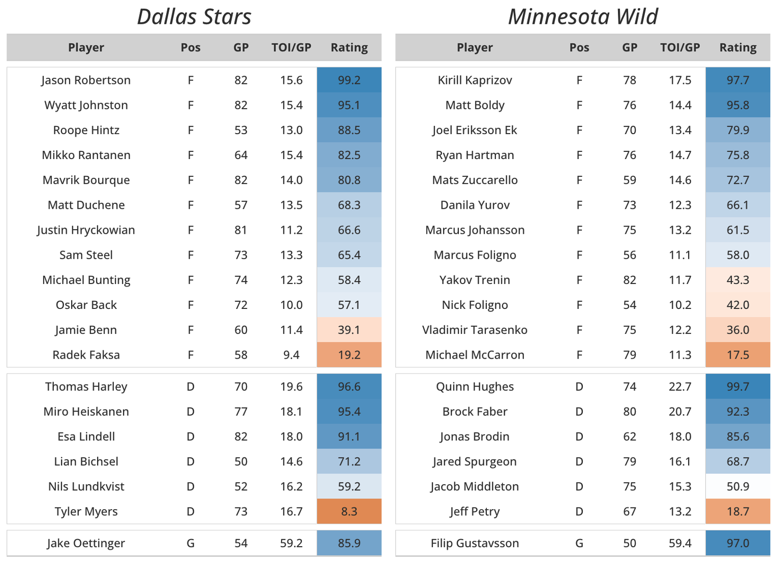 And now we arrive at, arguably, the best matchup in the first round (or the most unfortunate depending on the angle you’re looking from). And personally, I’m not ready to watch this. I don’t know if I can go through it. For months, the Central division has had three of the strongest teams in the standings, and it’s been practically guaranteed that Dallas and Minnesota would play in the first round. The Stars have been one of the most successful teams in recent years – advancing to the conference finals the past three seasons. In theory, this Stars team is quite similar to those prior teams, they’ve just arrived at those theoretical results in different ways. With possibly the best center depth in the league and one of the best defensive pairs in the game, it’s hard to see how they shouldn’t be considered one of the true contenders from the West (ignoring the Avalanche). Interestingly, the Stars’ results in the standings are not necessarily backed up by the typical underlying numbers we see from great teams. 22nd in EV RAPM CF±/60 (11th in the xG counterpart), a good chunk of their success can be attributed to that good ol’ combination of shooting (4th EV) and saving (7th EV) in arms with a lethal powerplay (2nd in PP RAPM GF/60 behind only the Oilers). The real secret for this team has been extremely under-covered depth in players like Mavrik Bourque, Justin Hryckowian, and Sam Steel; given Dallas’ multitude of injuries (Hintz, Seguin, Duchene, Bastian), they’ve found real value in several overlooked players that have allowed them to thrive. In net, Oettinger and DeSmith makeup one of the best tandems in the league behind only Colorado and Minnesota. Speaking of.