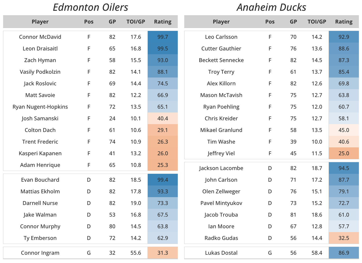 The Anaheim Ducks. Entering the playoffs for the first time since 2019, they’re almost an inverse of the Oilers. Finishing 16 points above our preseason projections with a core of rising stars in Carlsson, Gauthier, and Lacombe, no one except the smattering of Ducks fans in our mentions from October thought this team would amount to much. Now, like the Oilers, 92 points and third in the Pacific is, once again, not that much, but they’re here with a chance. A team comprised almost entirely of even-strength offense and nothing else (all of their other team RAPM metrics aside from EVO at all strengths are below average), and with close to 10 regulars below-replacement in GAR and xGAR, the Ducks have their work cut out for them. There are some glimmers of hope here: two of their regular forward lines finished among the top-50 in on-ice xGF% (min. 125 TOI), and their young talent is extremely promising and mostly fun. Leo Carlsson has been superb this year, and potential Calder finalist Beckett Sennecke performed quite well. Like the Oilers, their issue is goaltending. After a phenomenal season last year (25.2 GAR, 9th in the league), Lukáš Dostál struggled relative to expectations posting almost -5 goals saved above expected in April (I should know, he along with Shesterkin and Skinner lost me my fantasy championship). This series is going to be ridiculous if for no other reason than neither of these teams should really be here. But they are, and we’re going to watch them because I like messy hockey played after midnight.