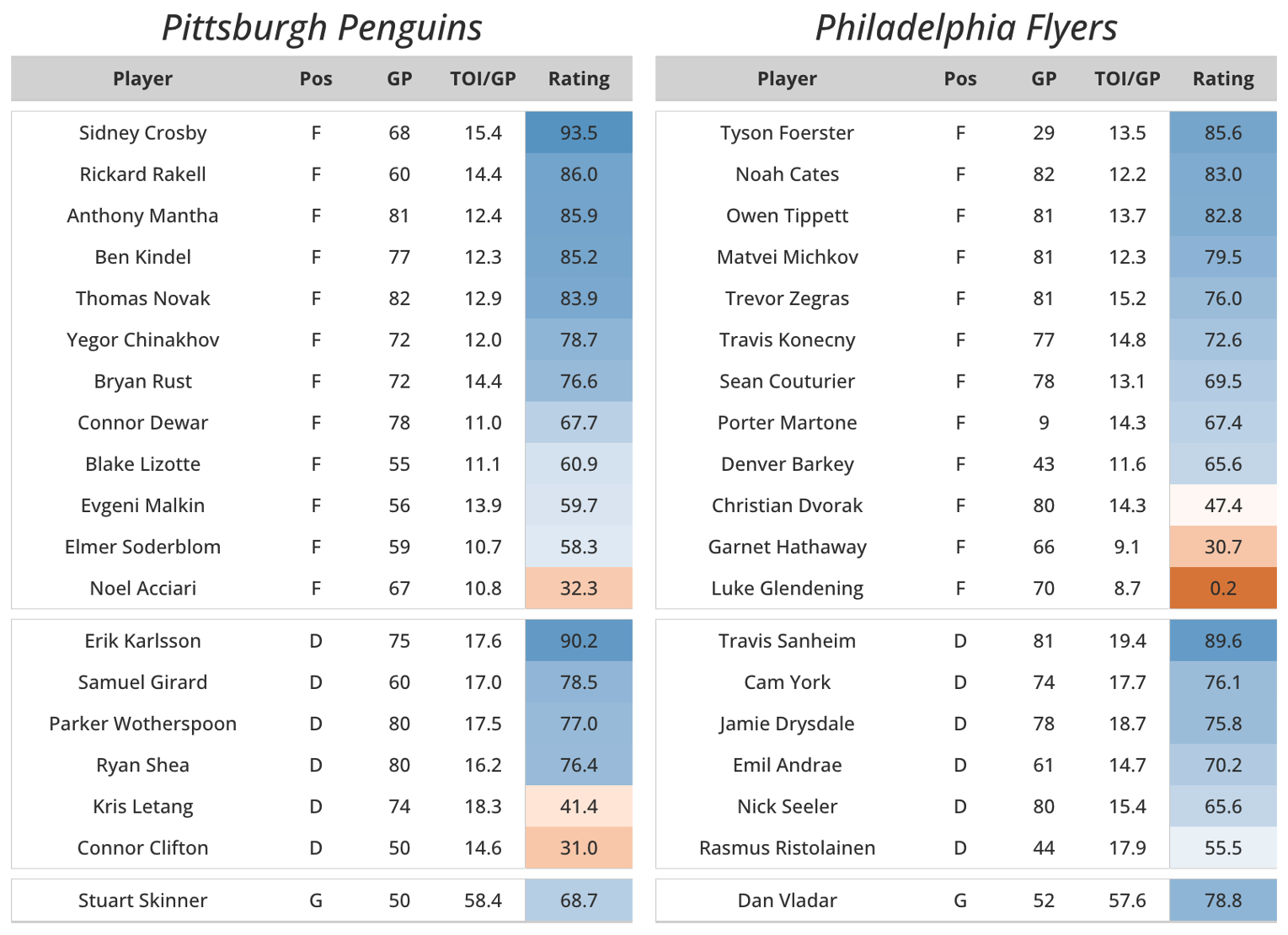 With Toronto in flames, Kyle Dubas and the Pittsburgh Penguins solidified home ice in a first-round matchup. Yes, a dumb division format may have given them an advantage, but lets focus on what matters here: long-time Evolving-Hockey favorite Anthony Mantha. With 33 goals and 5.0 xSPAR this season, it’s safe to say the Penguins wouldn’t be where they are without his help (I mean, you could probably say this about all of their players given the margins). Erik Karlsson and Ryan Shea also had strong contributions in combination with the unstoppable force that is Sidney Crosby, and on paper this team looks quite good. The key (or lack thereof) might be the lack of anchors, or at least none that play considerable minutes. The Penguins have faced injuries and recycled players all year. 34 skaters played at least 100 minutes in a Penguins uniform this season. They also traded Tristan Jarry in the middle of the season for Stuart Skinner who has been fair but unimpressive in his 27 games. Unlike the prior canvases that Kyle Dubas has painted, this one is built on depth. A true test of weak-link versus strong-link if they somehow make it to the conference finals or Stanley Cup Finals. While this team most likely isn’t poised to get that far, they have a good chance against their Pennsylvania neighbor (close enough).