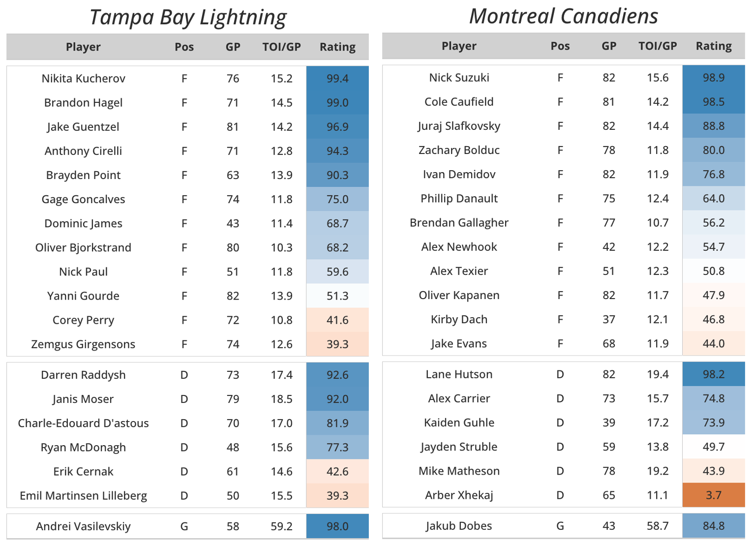 I’m not sure there’s a team we’ve talked about more on the podcast (go listen!) than the Canadiens this year. They completely exceeded everyone’s preseason expectations, challenging for home ice in the first round. Led by, dare we say, the “Core Four” (Suzuki, Caufield, Slafkovsky, and Hutson), Cole Caufield shined brightest with his nice and shiny 51 goals. He led all forwards in value from xGAR shooting (20.3 goals above average) – the fourth highest mark in the past 15 seasons. Ivan Demidov also had a strong rookie season after playing in a few regular season and playoff games last spring. He sits on the opposite wing of Caufield on the first powerplay unit. With Montembeault struggling to fill the starter role, rookie Jakub Dobes stepped up to take his spot, contributing 7.4 standing points above replacement (tied with Jesper Wallstedt among rookies). This team is fun. They have a few young players with some skill, a few old guys who aren’t as good as they once were, but they were as good once as they ever were (a traditional reference at this point). Youth, scrappiness, and inexperience can be a strength for a team that wasn’t supposed to be here, but their lack of depth and experience is showing in our projections. They’ll likely struggle in the defensive zone where their aggressive man-to-man style at 5v5, which lacks layers, will be put to the test by Jon Cooper’s cycling style. Will the Core Four push for more, or will the Canadiens be going home in the first round again?