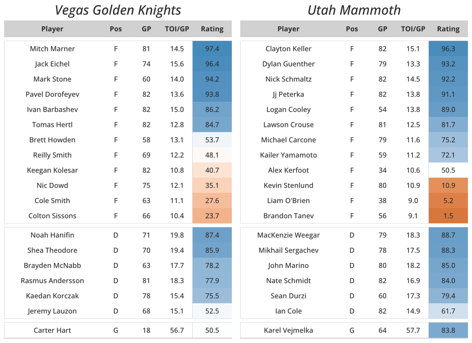 Unlike the Knights, Utah met our expectations (which were, admittedly, a bit high entering the season). Finishing with 94 points (0.4 points below our projections), the Mammoth proved that they were a force to be reckoned with – at least in the ’25-26 Western conference. The franchise has one playoff appearance since 2012, and they’re entering the 2026 playoffs for the first time in six years. While their record might be underwhelming, they exemplify a trend among middling western conference teams: strong even-strength underlying numbers. 5th in EV RAPM CA/60± and 6th in EV RAPM xGF/60±, this feisty team brings with it a spirit for winning just enough games, with little flare to get them where they need to be. A surprisingly solid top-6 centered by Schmaltz and Cooley with Guenther and Yamamoto on the wing, Utah’s top-end is not the concern here; their depth raises eyebrows. With possibly the worst fourth line entering the playoffs, and a very questionable current 3rd line (it’s moved around a ton but Utah lost the Peterka trade??), there are some real issues here. However, given that their opponent faces similar issues, this ends up being the closest series in the first round per our model. I’m rooting for Utah because we were more right about them before the season started and I also dislike Vegas quite heavily. Although it would be funny if Marner was really good and Leafs fans had to watch that. Ok, sorry, that was mean.