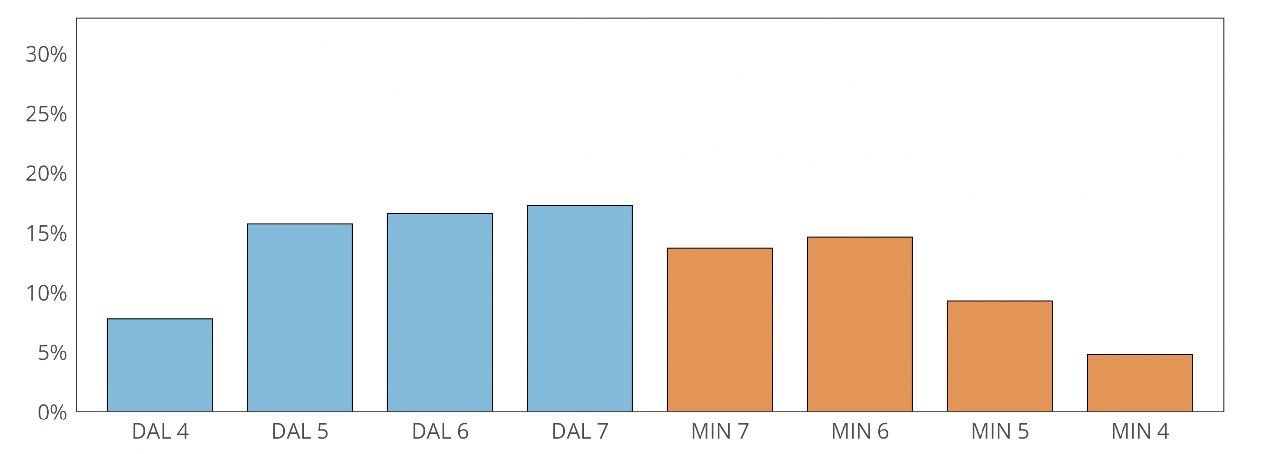 For the simulation, in a given game, we only care about the projected winning % for the home team. Take DAL/MIN. The process laid out above gives us a winning % for each team. In game 1, DAL is the home team. We replace MIN’s projected probability with a random % between 0 and 1 since they are the away team. If DAL’s projected winning % is higher than the random number, DAL “wins” that game (they “lose” if it is lower). In game 3 when MIN is the home team, we do the same for DAL (we replace their winning % with a randomly generated %). This is done for each team game in all series and then repeated 50,000 times. Once the simulation is complete, we check how many times each team won a game, sum the total games won in a series, and arrive at each team’s projected probability.