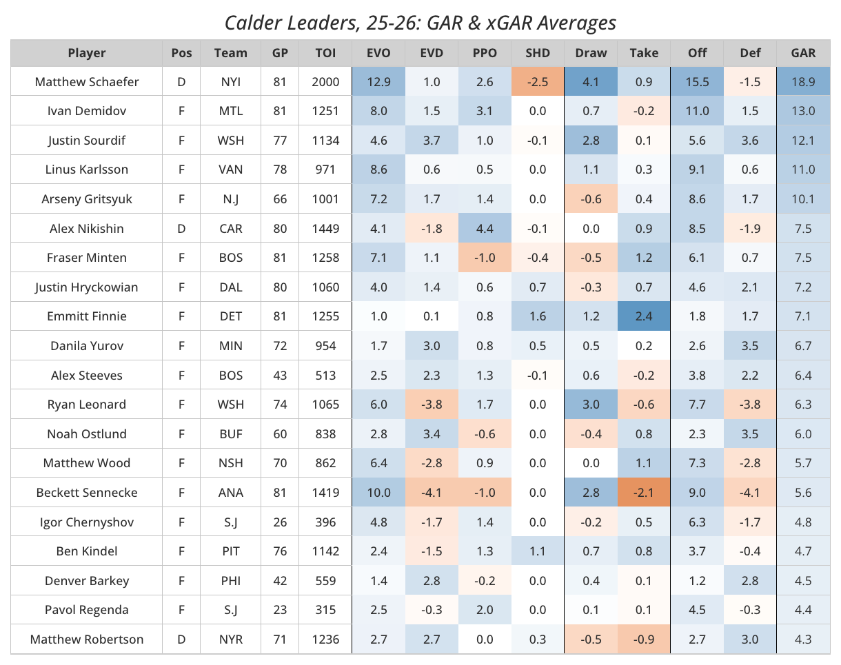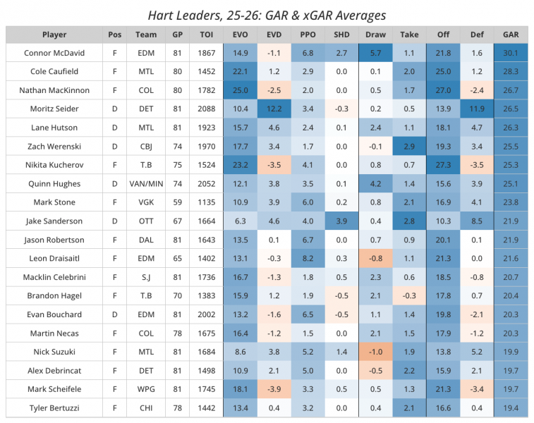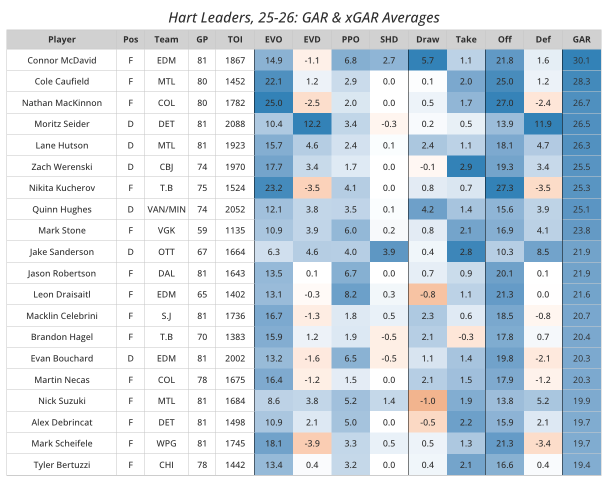 This is the same system we’ve always used, which Luke explained a year ago quite well (basically the same follows). We use the average of our xGAR & GAR metrics for the Hart & Norris rankings and the average of the xGAR & GAR EVD components for the Selke rankings. The Calder is determined using a z-score transformation of average xGAR & GAR along with rookie goalie GAR (the goalie side of the xGAR model). The Vezina is a simple ranking of total goalie GAR for the given season (again, this is the goalie side of our xGAR model). Lady Byng is determined by the leaders in our penalty goals component for GAR/xGAR (the same “model” is used for both systems). It’s difficult to combine xGAR and GAR with objective “precision”. I’ve used a weighted average in the past, but I figured a simple average would be the least subjective. I normally present our picks in three tiers with a total of anywhere from 6-12 players (the Lady Byng is always extremely close so I only post 5 players) – we’ll be displaying those tiers for each award below. For most awards we’ve limited it to 8 players.