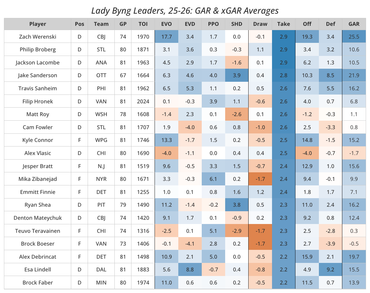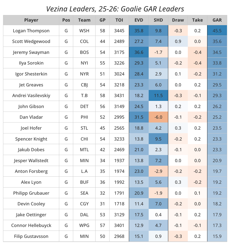 • The conditional formatting is scaled based on the quantile (0%/50%/100%) for each column relative to the respective population. For example, the EVO column for skaters in the Hart table below is shaded from dark orange (0%), to white (50%) to dark blue (100%) for all skaters. Skater awards are based on all skaters in the league, goalies the same.