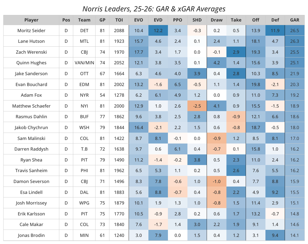 Zach Werenski is the consensus pick, and it sort of makes sense. With two back-to-back seasons of Norris-caliber performance after missing parts of multiple seasons due to injury all while playing for the same team, I get why it might be “his time”. The narrative drives everything with these awards, but in this case Werenski deserves quite a bit of consideration. Hell, the top-four in our ranking deserve recognition here, and this omits Evan Bouchard’s great season, which I’ll also omit since we’ve gotten sick of talking about how underrated he is. The Norris Trophy might just be the most interesting award of the season.