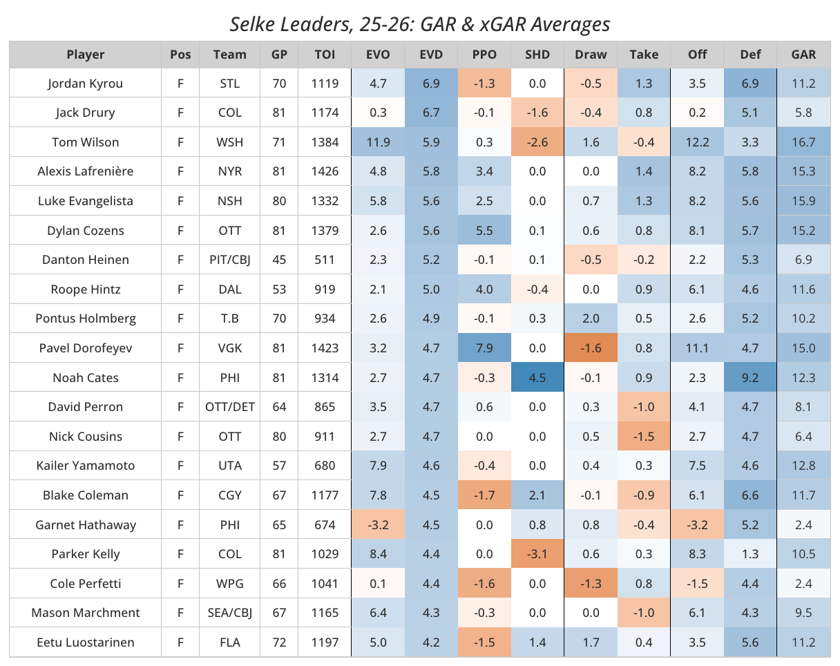 Rounding out our top three are two very interesting players. As I discussed above in our Calder section, the Capitals found something special defensively with Tom Wilson and Justin Sourdif. Well-known for various other things not necessarily related to defense, Wilson may have overtaken Marcus Foligno as the most consistent defensive forward in the game (now 2nd in xGAR over the last three seasons). Finishing 2nd and 3rd respectively in xGAR and GAR among all Capitals skaters, it’s hard to understate how important he’s been for the team while moving around the lineup in Washington. And then we have another out of nowhere Colorado player in Jack Drury rounding out our top three. With consistent depth TOI and a revolving door of teammates, Drury’s found a place not unlike other unsung depth guys from years past (O’Connor, Lehkonen). I mean, if this was a normal year, Drury would be our Selke pick and people would think we were absolutely insane. Maybe I should just manually change the chart while Luke isn’t looking.